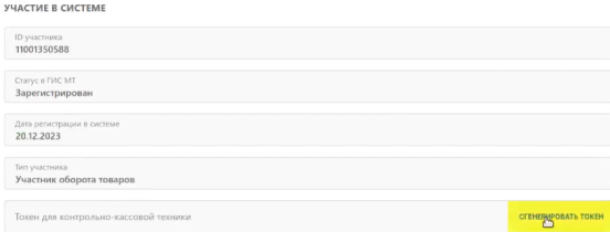 где в разделе профиля найдите токен для контрольно-кассовой техники. Нажмите на «сгенерировать токен».